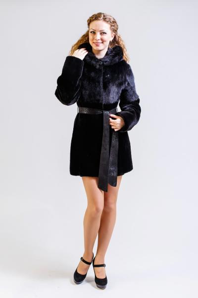 -норковый верх (кокетка из цельной норки), капюшон обработан норкой, низ рукавов и юбка из австралийского мутона, борта и пояс кожа (итальянская)